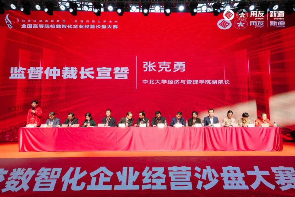 本次大赛裁判长、东北林业大学经管学院会计系主任丁华、大赛仲裁长、中北大学经济与管理学院副院长张克勇、参赛学生代表王浩昊在开幕式中郑重宣誓。