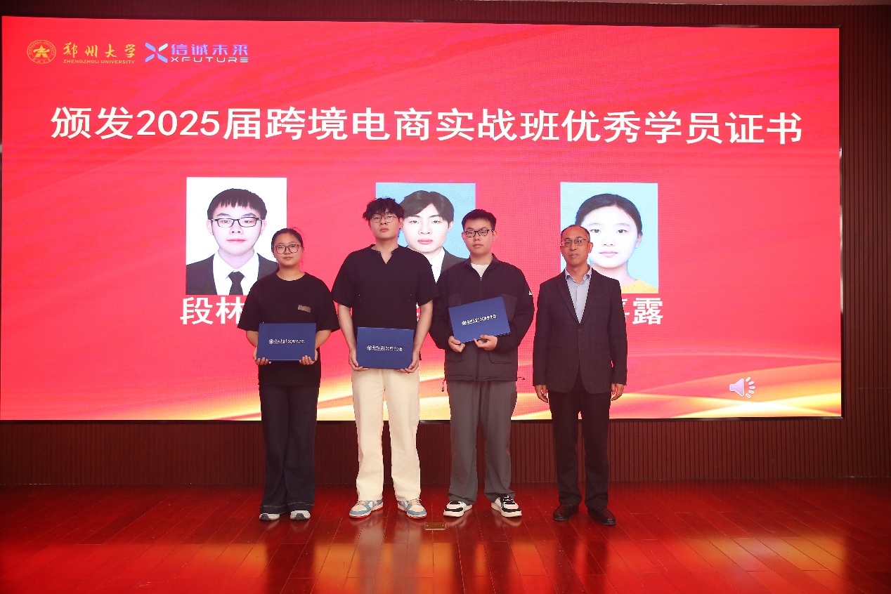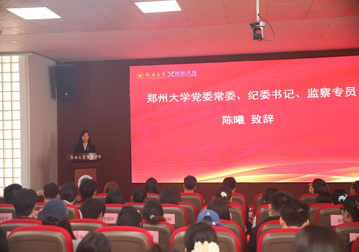 4月18日,信诚未来“XFUTURE星耀计划”第二届(2026)跨境电商实战班开班暨奖学金发放仪式在主校区举行。郑州大学党委常委、纪委书记、监察专员陈曦,深圳市信诚未来科技有限公司创始人、总经理、管理学院2002级工业工程专业校友王会中,学校相关职能部门及院系负责人、深圳市信诚未来科技有限公司高管团队、管理学院师生代表160余人参加活动。仪式由管理学院执行院长、党委副书记井辉主持。