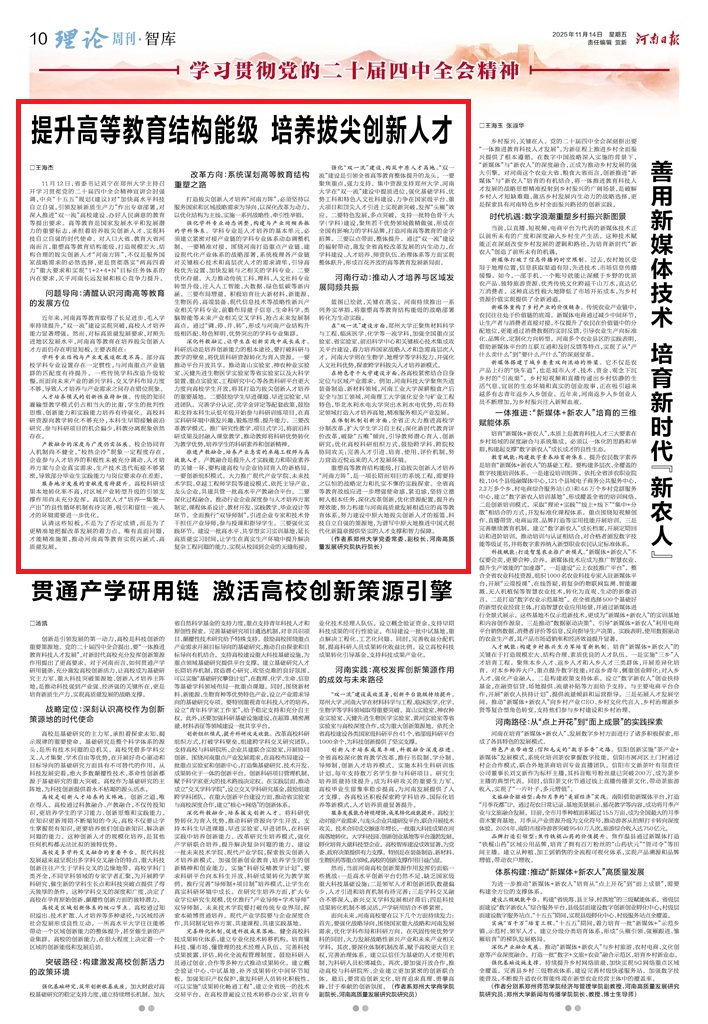 11月12日,省委书记刘宁在郑州大学主持召开学习贯彻党的二十届四中全会精神宣讲会时强调,中央“十五五”规划《建议》对“加快高水平科技自立自强,引领发展新质生产力”作出专章部署,对深入推进“双一流”高校建设、办好人民满意的教育等提出要求。高等教育是国家发展水平和发展潜力的重要标志,承担着培养拔尖创新人才、实现科技自立自强的时代使命。对人口大省、教育大省河南而言,重塑高等教育结构能级,打造规模宏大、结...