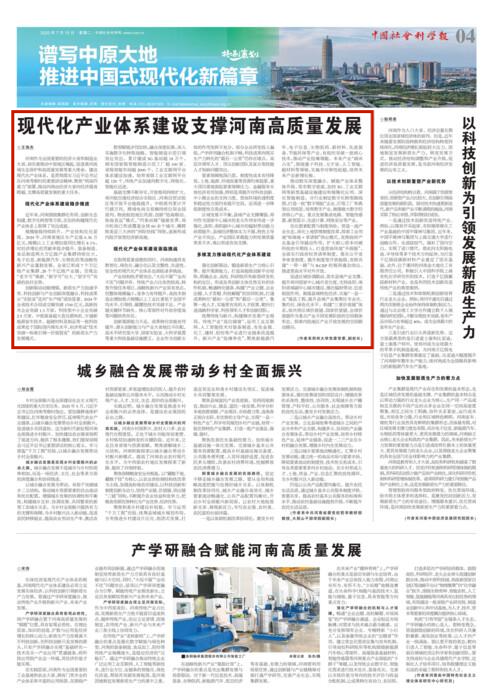 近日,郑州大学党委常委、副校长,河南高质量发展研究院执行院长王海杰教授接受中国社会科学报采访,聚焦习近平总书记深入河南考察调研重要讲话精神,为河南高质量发展与高效能治理建言献策。2025年6月4日,《中国社会科学报》头版头条对有关内容进行了报道。《中国社会科学报》头版头条对有关内容进行了报道接受采访中,王海杰指出“中原制造”的产业布局日趋完善,将为中部崛起锻造更加坚实的支点;建议持续“推动科技...