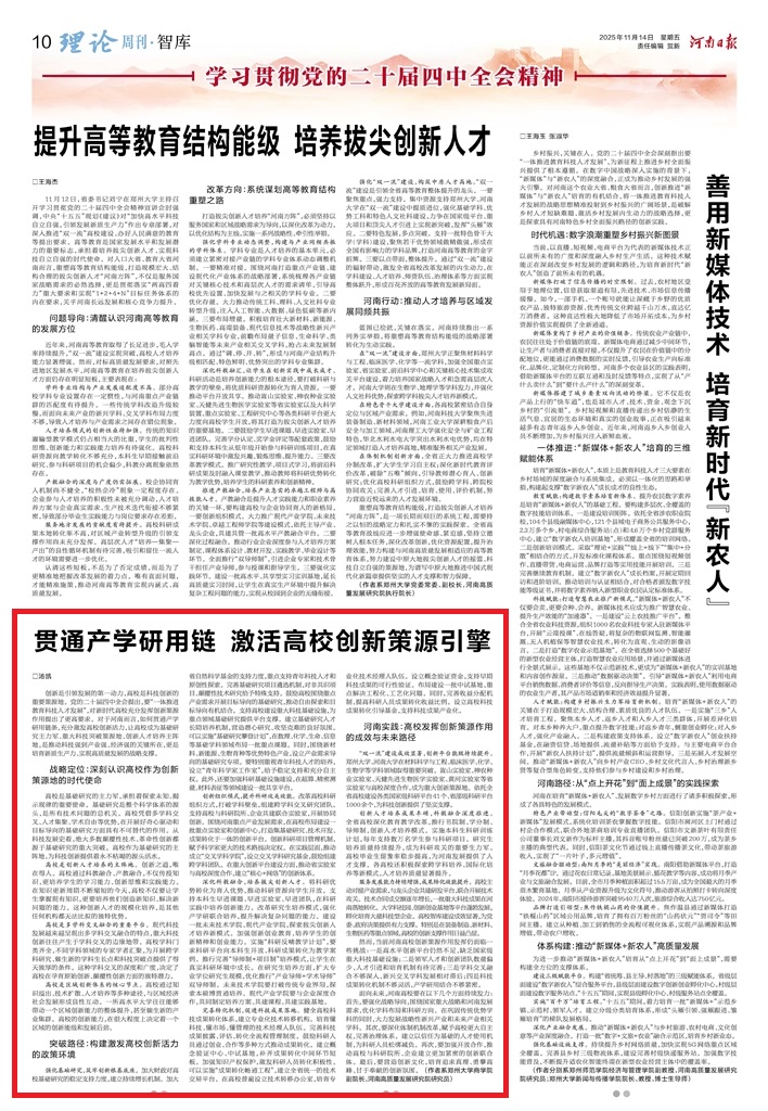 创新是引领发展的第一动力,高校是科技创新的重要策源地。党的二十届四中全会提出,要“一体推进教育科技人才发展”,对新时代高校充分发挥创新策源作用提出了更高要求。对于河南而言,如何贯通产学研用链条,充分激发高校创新活力,让高校成为基础研究主力军、重大科技突破策源地、创新人才培养主阵地,是推动科技强到产业强、经济强的关键所在,更是培育新质生产力、实现高质量发展的战略支撑。战略定位:深刻认识高校作为创...