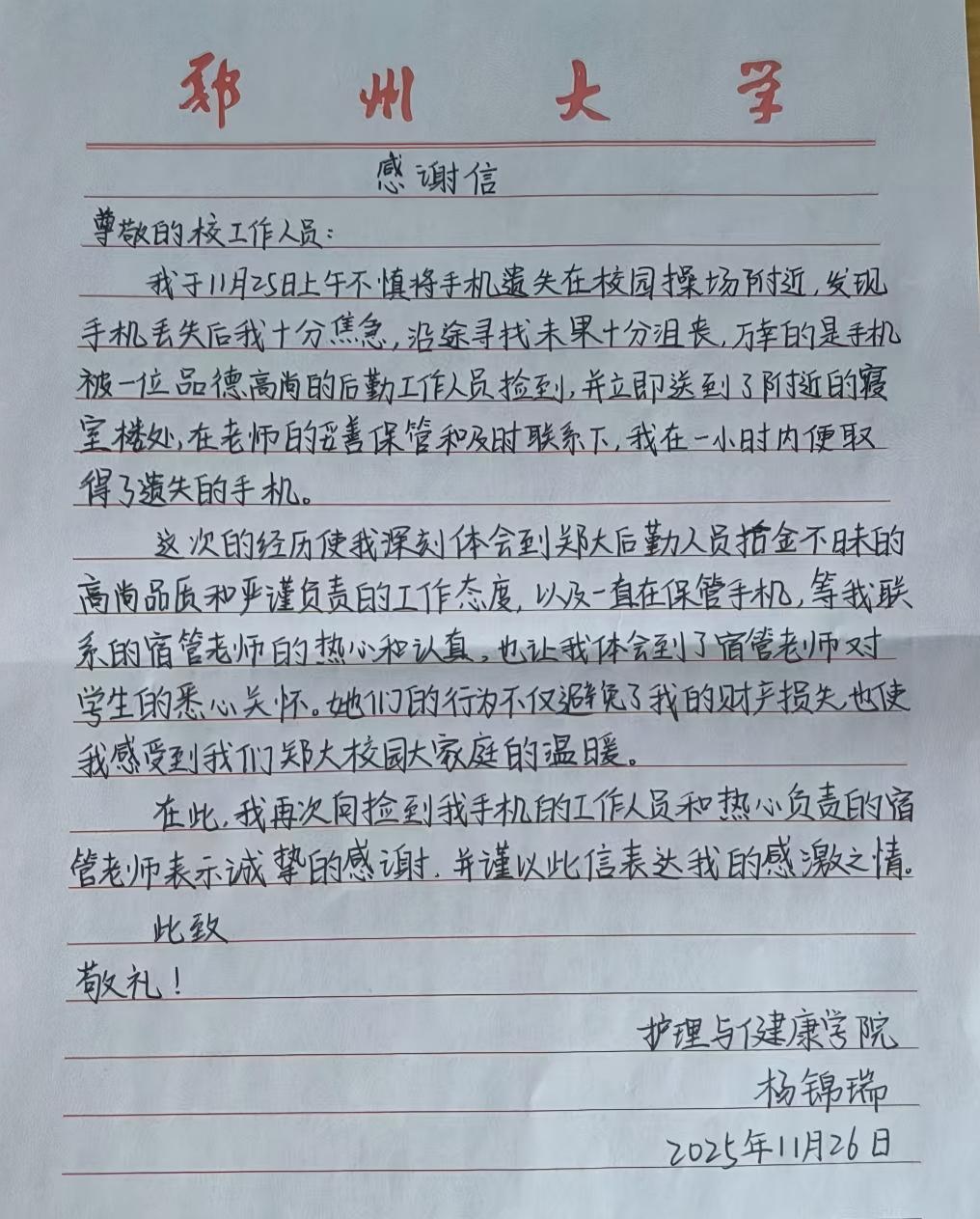 信中提及,杨同学于11月25日上午不慎将手机遗失在操场附近,后勤工作人员拾获手机后,第一时间送至附近宿舍楼值班处。宿管老师随即妥善保管手机,并主动联系失主,仅用一小时便让手机物归原主,高效暖心的服务让杨同学深受感动。