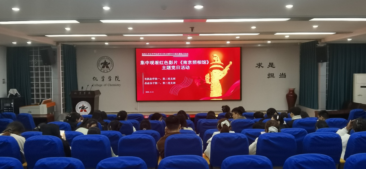 为铭记历史,弘扬伟大抗战精神,11月8日晚,化学学院于化学馆208报告厅举办“集中观看红色影片《南京照相馆》,共筑党员精神家园”的主题联合共建党日活动。化学学院研究生辅导员杨灿与研究生有机化学第一、第二党支部,晶态分子第一、第二党支部的全体党员参加本次活动。