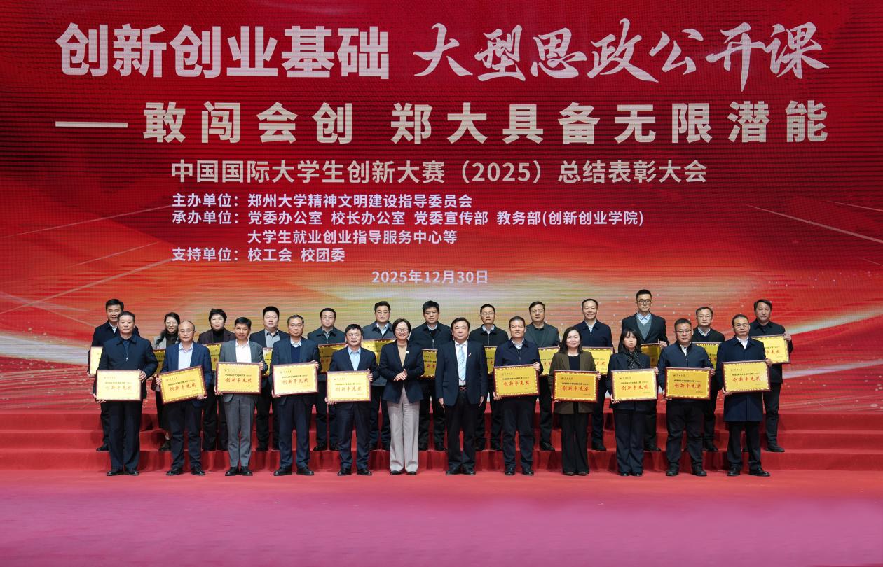 2025年12月30日,郑州大学中国国际大学生创新大赛(2025)总结表彰大会暨“敢闯会创——郑大具备无限潜能”大型思政公开课在主校区中心体育馆举行。省教育厅、郑州市教育局相关负责人,全体在校校领导,大赛专项组成员、获奖师生代表及志愿者等千余人齐聚现场。化学学院凭借强劲的创新实力与扎实的备赛积淀,荣获郑州大学中国国际大学生创新大赛(2025)创新争先奖,彰显了学院在创新创业教育领域的扎实成效与育人实力。