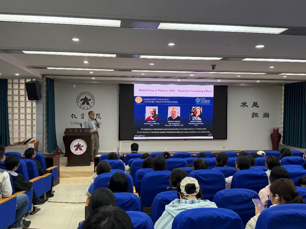 在题为《Molecular Spin Qubits toward Quantum Computer and High-Density Memory Devices in Molecular Magnets》的学术报告中,Yamashita教授不仅详细阐述了单分子磁体在高密度存储与量子计算领域的巨大应用潜力,系统介绍了其团队在分子自旋量子比特设计方面的核心策略,还重点展示了课题组在高密度存储器件方面的前沿成果。此外,Yamashita教授还结合自身科研经历,分享了科学研究的内涵。整场讲座逻辑严谨、内容前沿,现场师生围绕实验设计、作用机制等关键问题与教授展开了深入而热烈的交流,学术氛围浓厚。