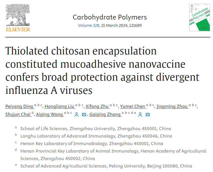 近日,实验室在流感疫苗研究中取得重大进展,利用生物可降解的巯基化壳聚糖成功开发了一种针对甲型流感病(IAV)的粘膜粘附性通用型纳米疫苗。相关研究论文“Thiolated chitosan encapsulation constituted mucoadhesive nanovaccine confers broad protection against divergent influenza A viruses”发表在发表在《Carbohydrate Polymers》(10.1016/j.carbpol.2023.121689)期刊上,该刊是化学领域顶级期刊之一(中科院一区,TOP,IF=11.2)。教师丁培阳为该论文第一作者,王爱萍教授和张改平院士为通讯作者。