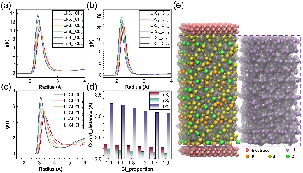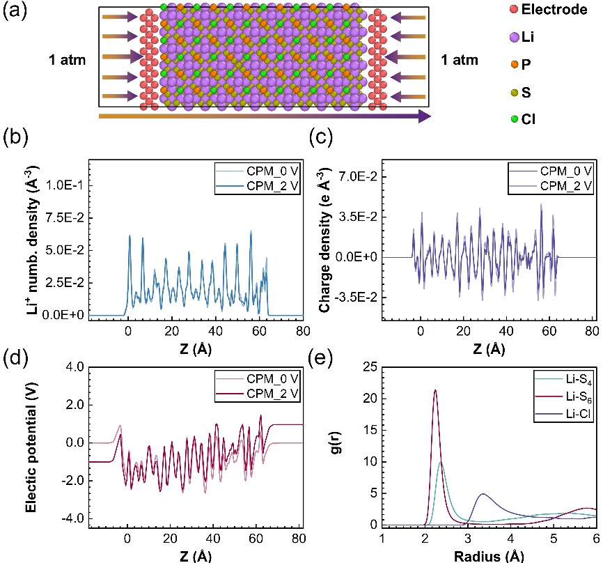 图1. LPSC 电解质模型快照:(a) 初始模型;(b) 锂离子浓度分布;(c) 电荷密度分布;(d) 电势分布;(e) 锂离子的径向分布函数。