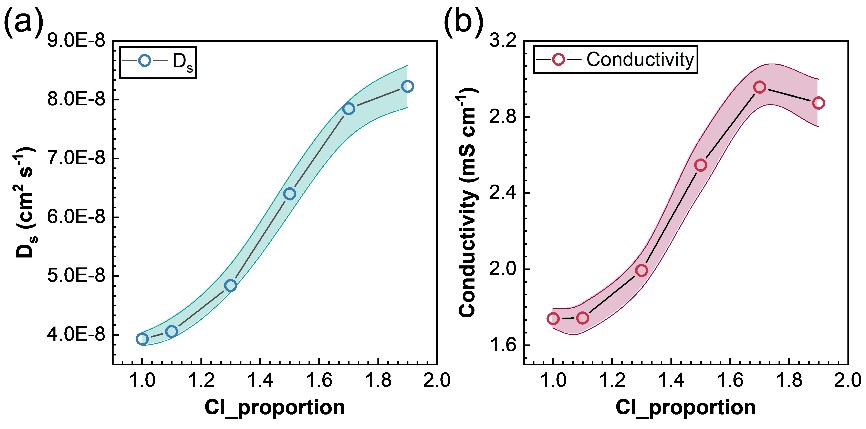 图5. Li6-xPS5-xCl1+x中的传质性能:(a) 扩散系数随Cl含量的变化;(b) 电导率随Cl含量的变化。