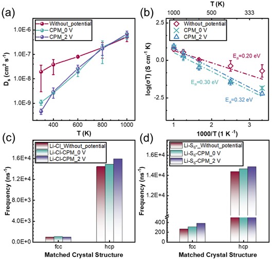 图3. 温度和电势对LPSC中锂离子迁移的影响:(a) 锂离子扩散速率随温度的变化;(b) 随温度变化的阿伦尼乌斯曲线; (c, d)锂离子在恒电势下与阴离子形成的空间结构。