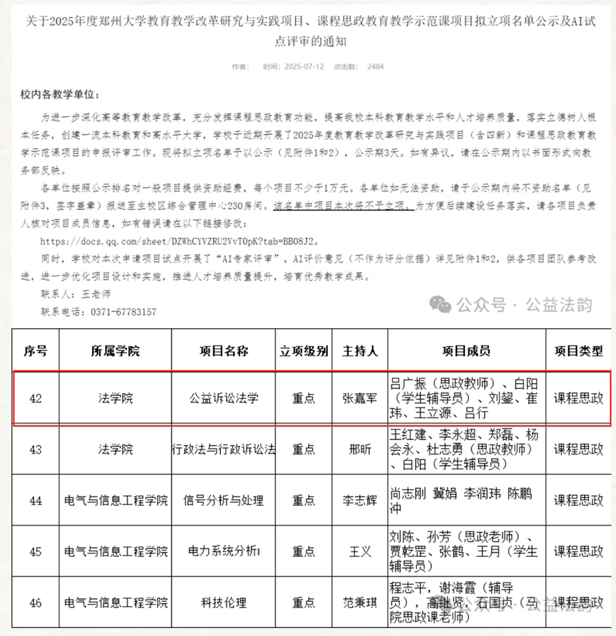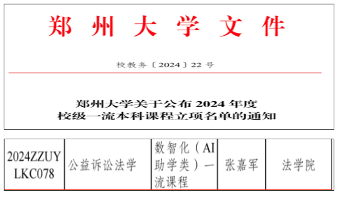 近日,河南省教育厅公布2025年度河南省本科高校精品课程拟立项建设名单,经学校评审推荐、省级专家评议,郑州大学法学院党委书记、郑州大学检察公益诉讼研究院院长张嘉军教授作为课程负责人的《公益诉讼法学》课程入选2025 年度河南省本科高校研究性教学精品课程。
