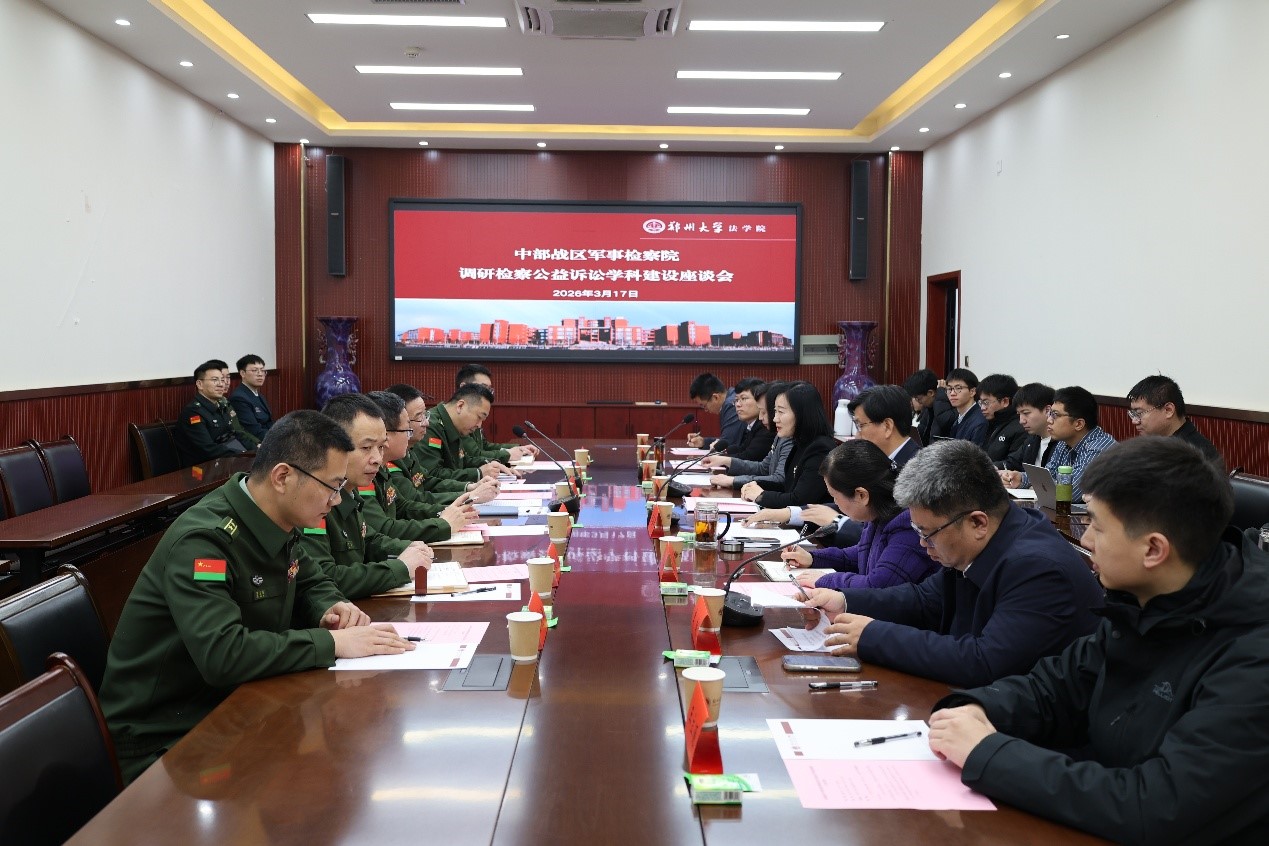 3月17日上午,中部战区军事检察院检察长孔凡明、第四检察处处长赵彦陶、郑州军事检察院检察长魏京哲等一行来我院走访调研,双方共同召开涉军公益诉讼理论研究座谈会。郑州大学党委常委、纪委书记、监察专员陈曦出席座谈会,法学院党政领导班子、部分师生代表参加座谈会。座谈会由郑州大学法学院副院长李朝主持。