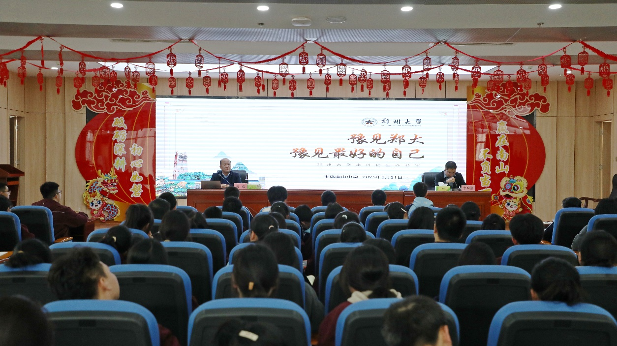 3月31日,魏涛到宝鸡南山中学进行招生座谈宣讲。南山中学副校长龙升远、梁丽珍对魏涛表示欢迎,南山中学总督学、工会主席杨秋红,校办公室副主任雷梦婷等校领导共同参加了座谈会。龙升远介绍了南山中学的办学情况。魏涛对南山中学为郑州大学输送优质生源表示了感谢,并代表学校授予南山中学“优质生源基地”牌匾。随后,魏涛为师生作招生宣讲并回答了同学的提问。宣讲后,魏涛还为师生做了《国学的魅力》科普讲座。