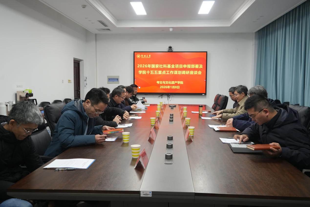 王海杰讲话。他充分肯定了考古学科在学校整体发展布局与学科评估中的重要地位,并指出了学院在项目申报工作中存在的差距。他表示,必须扎实推进有组织的科研与有组织的学科建设,精准对接国家战略需求,积极产出更多高质量成果,为河南文物强省、考古强省建设提供有力支撑。他强调:一要强化精准化管理与精细化服务,通过构建分阶段推进、分层次覆盖的系统辅导体系,靶向破解申报痛点,全面提升项目申报质量。二是优化制度设计与外部督促机制,加快现有项目结项进度,畅通项目管理闭环,充分释放教师参与新项目申报的活力与潜力。三要突出政策导向与人才激励效能,在职称评审、绩效考核等人才评价体系中,加大对重大标志性成果的权重倾斜,使资源配置真正服务于关键指标的突破。四要加大人才引进与队伍建设力度,牢牢把握政策窗口期,加速扩充师资队伍规模,夯实学科高质量发展的人才根基。五要深化学科交叉融合与转型提升,打破传统文科研究路径依赖,通过跨院系协同攻关、引进交叉学科方向人才等举措,全面增强核心竞争力。六要秉持开放思维整合优质资源,充分发挥综合性大学的平台规模优势,主动链接校内外优质资源,推动潜在优势转化为竞争优势,为学科发展注入持久动力。