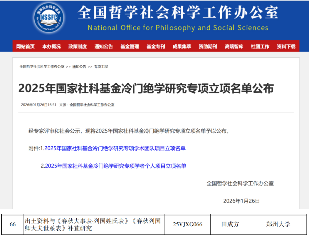 近日,全国哲学社会科学工作办公室公布2025年度国家社会科学基金冷门绝学研究专项立项名单,郑州大学共有4个项目立项。其中,考古与文化遗产学院田成方教授的“出土资料与《春秋大事表·列国姓氏表》《春秋列国卿大夫世系表》补苴研究”获批学者个人项目立项,充分展现了学院在相关领域的深厚学术底蕴与强劲科研实力。