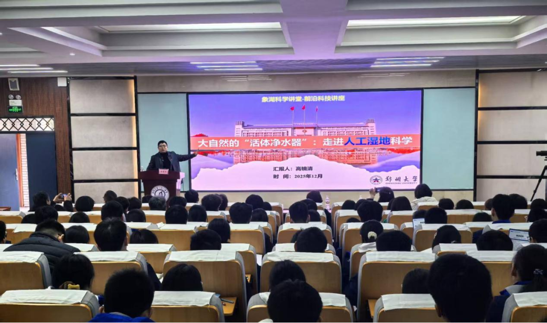 12月28日,由河南省科技馆、郑州大学科学技术研究院(郑州大学科协)及郑州大学本科招生办公室共同主办的象湖科学讲堂前沿科技系列第十讲《大自然的“活体净水器”:走进人工湿地科学》在郑州市第一〇一中学成功开讲。讲堂邀请郑州大学科学技术研究院副院长高镜清教授作主题报告。河南省科技馆、郑州大学、郑州市第一〇一中学等单位相关负责同志出席活动,郑州大学和郑州市第一〇一中学的师生现场参加讲座。河南省科技馆、郑州科技馆、许昌科技馆等同步进行了线上直播,累计约2000人参与讲座。