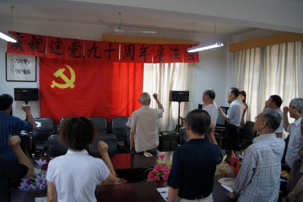为迎接中国共产党建党九十周年的到来,近日来东校区各党支部纷纷举行了不同形式的座谈会。会议室庄严肃穆,鲜红的党旗悬挂正中,参加座谈会的部分离退休老党员面对党旗,庄严宣誓,重温入党誓词,回顾党的光荣历史,追忆个人成长之路。座谈会上老党员们积极发言,分别结合各自的切身经历,舒怀表达对党的热爱之情。大家一致表示,虽然我们从各自的岗位上退下来了,但今后更要政治坚定、理想永存、思想常新、发挥余热、为党增辉。座谈会在《没有共产党,就没有新中国》的歌声中圆满结束。