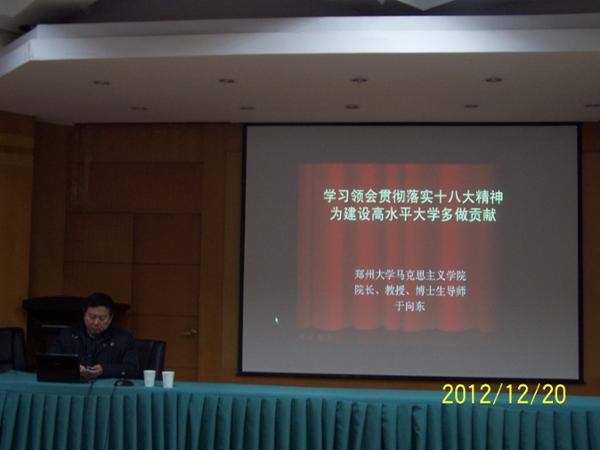 于向东 教授首先简要介绍了党的十八大召开的重要意义和所取得的重大理论成果。接着他从十八大会议确定一个鲜明主题、贯穿一条主线、提升一项指导思想、明确一个奋斗目标、部署一个总布局、推进一个大发展、坚持一个中国原则、推动一个世界和谐、强调一项新的伟大工程等九个方面详细向学员们宣讲了十八大报告的新思想、新观点、新部署。最 后于 教授说,十八大报告内涵丰富,思想精粹,高屋建瓴,博大精深,具有很强的时代性、理论性、实践性与指导性,希望大家联系实际,认真学习领会,贯彻落实十八大精神,为高水平大学建设做贡献。