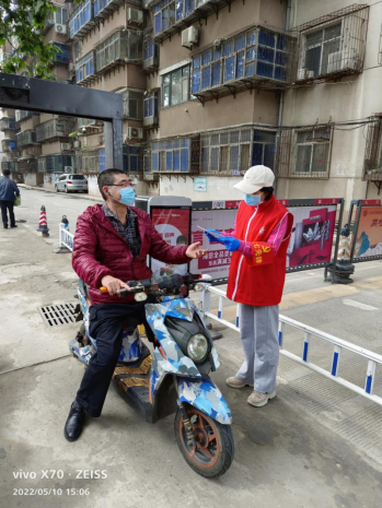 自5月4日开始,医学院校区纪晓琴副处长主动请战,积极配合社区共同抗击疫情。为有效阻断病毒传播途径,她每天值守校区大门,无论刮风、下雨、寒热,每天口干舌燥,毅然选择坚守。在疫情最严重的时候,她与志愿者们到各楼栋、各家各户敲门喊人,让居民无一遗漏到楼下排队做核酸检测,让潜在的病源传染隐患灭杀在防控措施之下,遏制疫情进一步发展。