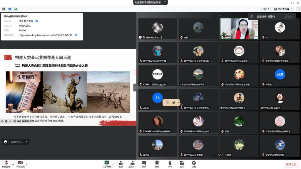 12月16日下午,离退处党委联合哲学学院党委,按照校党委的安排部署,邀请马克思主义学院副院长杨静娴教授举行了党的二十大精神宣讲报告会,会议以腾讯会议的网络会议形式举行,会议由寇晓明书记主持。