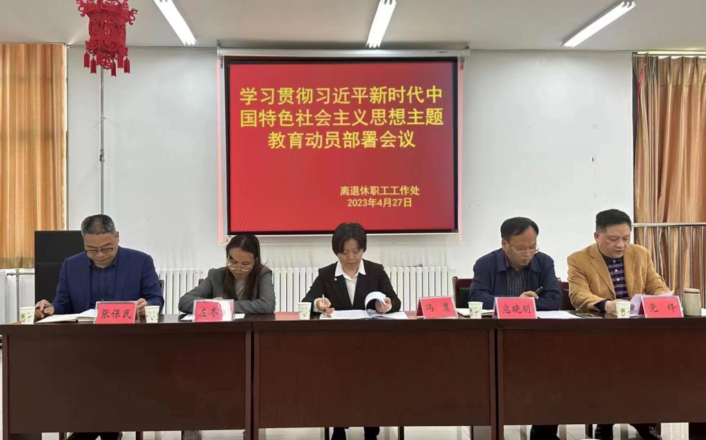 2023年4月27日上午,离退休职工工作处党委于盛和苑老干部活动中心301教室召开了学习贯彻习近平新时代中国特色社会主义思想主题教育动员会。离退处在职教职工全体党员、校主题教育第三工作组成员参加了动员会。