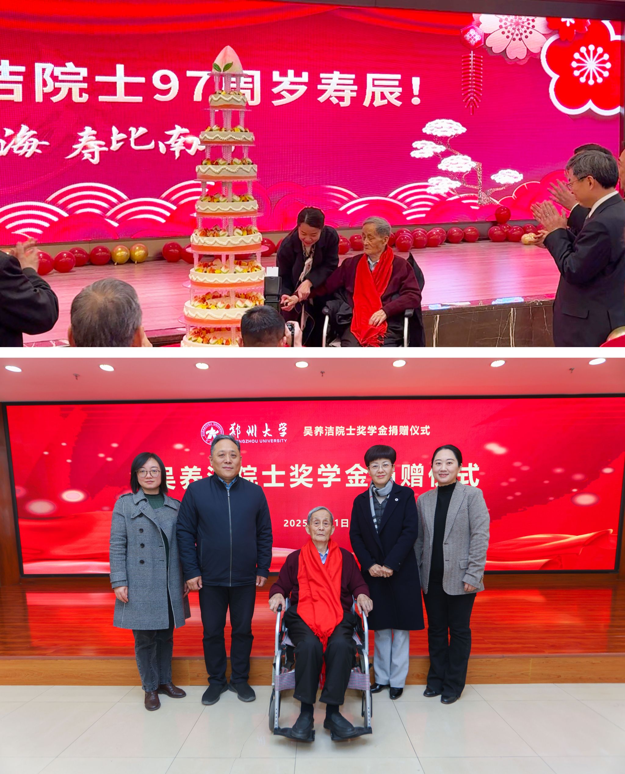 祥蛇贺瑞,岁序更新。在这万象启新的美好时刻,我们迎来德高望重的吴养洁院士 97周岁寿辰。为了表达对吴院士的崇高敬意与深深祝福,同时推动郑州大学科研教育事业的蓬勃发展,离退处联合化学学院、发展基金会于2025年1月1日举办了“吴养洁院士 97岁寿辰暨吴养洁院士奖励基金捐赠”仪式。