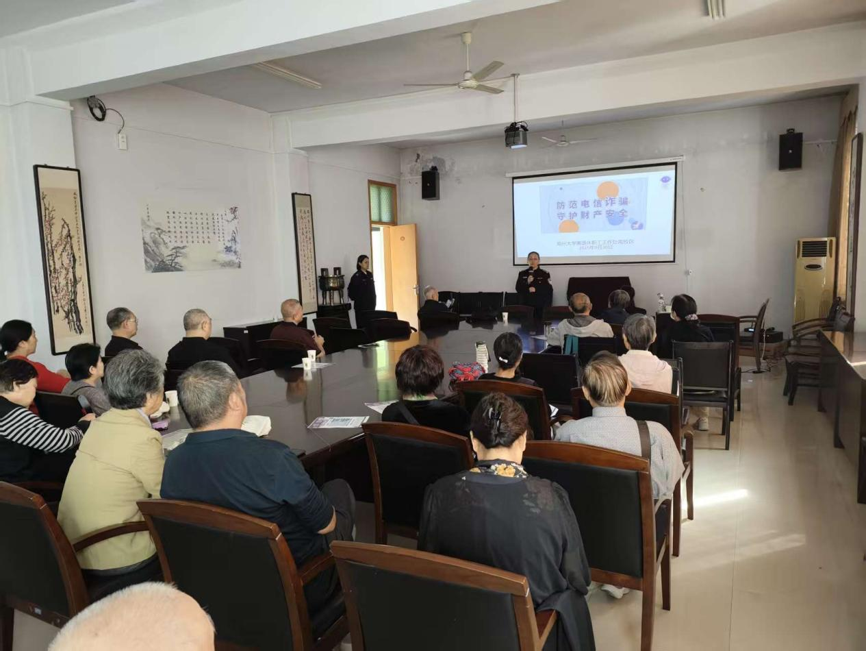 南校区于9月30日精心组织了一场以“筑牢安全防线,守护幸福晚年”为主题的反电信诈骗宣传教育活动。活动特别邀请了大学路派出所的民警张玉苹同志开展宣讲,通过专业讲座与案例视频相结合的形式,为老同志们上了一堂生动而深刻的安全教育课。