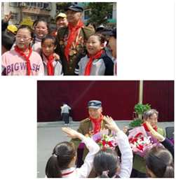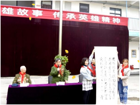 讲座结束后老英雄杨瑾为附小赠送获奖墨宝一幅,勉励同学们继续发扬爱国主义精神。少先队员代表发言表示要学习英雄前辈坚强不屈、奋勇向前的精神,随后同学们围绕着他们身边久久不愿离去,只为了能亲手抚摸一枚枚金灿灿沉甸甸的军功章,能留下他们的签名,能拉着他们的手再听一遍惊心动魄的故事。