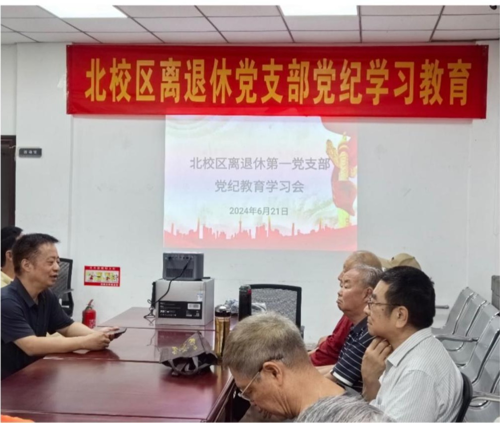 为进一步推动党纪学习教育走深走实,6月21日,北校区退休第一党支部在本校区活动中心开展了“党纪学习教育”主题党日活动。