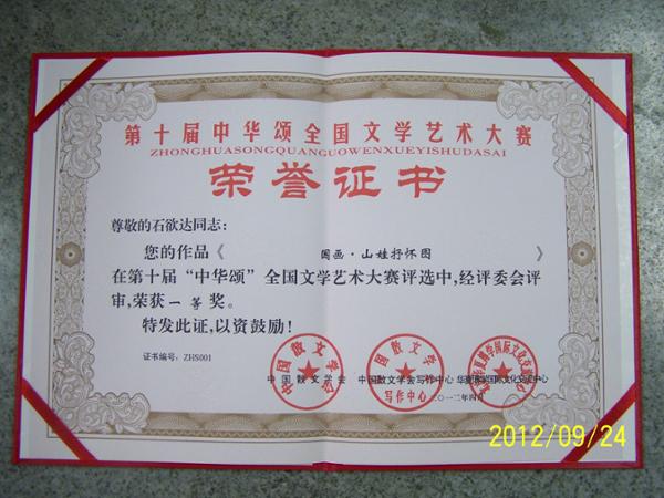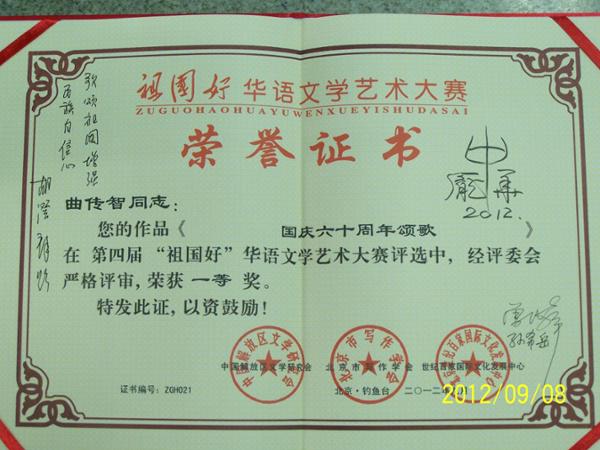 我校退休教授曲传智、石欲达在第四届“祖国好”华语文学艺术大赛征稿期间,本着对伟大祖国拳拳赤子之心,以优秀诗篇和国画歌颂了共产党好,社会主义好,改革开放好,伟大祖国好的时代旋律,投稿后,经评委一致肯定,脱颖而出荣获诗词、《国画.山河锦绣图》一等奖,为我校争得了荣誉。