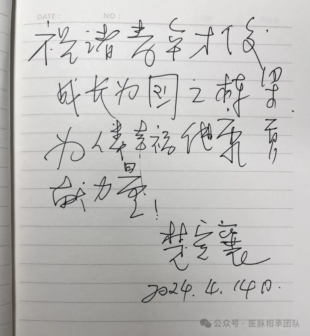 楚宪襄教授因患癌影响发声,说话有些吃力,依然热情接待了一脉相承团队的青年学子,共同分享自己的人生经历、学习经验,对培养科研思维提出了自己的见解。楚老寄语青年学子:将来要有所成就,就要有所经历。好医生要求具备解剖基本知识,没有扎实的解剖基础,很难做一个好医生。当然我不希望学生一天到晚读书,读书时要精力集中认真学习,休息的时候好好休息。保持一个健康的体魄和广阔的胸怀。在学习中一定要不耻下问,绝对不要不懂装懂。要保持一个对新鲜事物敏感和勇于探索的精神和勇气。及时总结经验、吸取教训。胜不骄,败不馁!