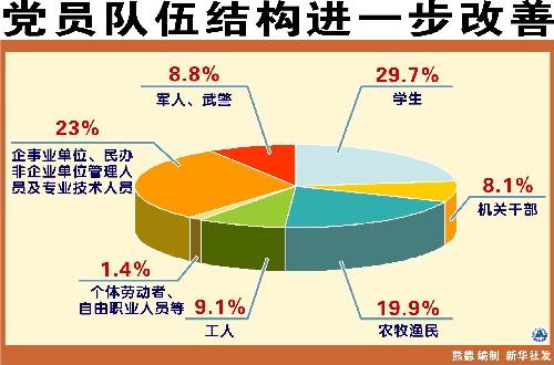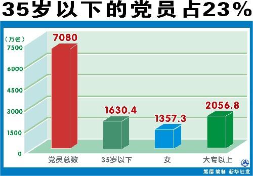 全国党员中,35岁以下的党员占23%,比上年增长0.3个百分点;女党员占19.2%,比上年增长0.6个百分点;具有大专以上学历的党员占29%,比上年增长1.7个百分点。