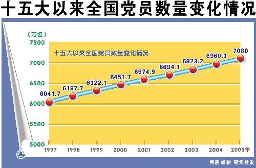 新华网北京6月18日电(记者李亚杰)保持共产党员先进性教育活动自2005年1月开展以来,党员素质和党组织的凝聚力、战斗力明显增强,党在人民群众中的威信进一步提高。中央组织部最新党内统计结果显示,截至2005年底,全国党员总数为7080万名,比上年增长1.7%。党的基层组织352万个,比上年净增4.3万个,增长1.2%。