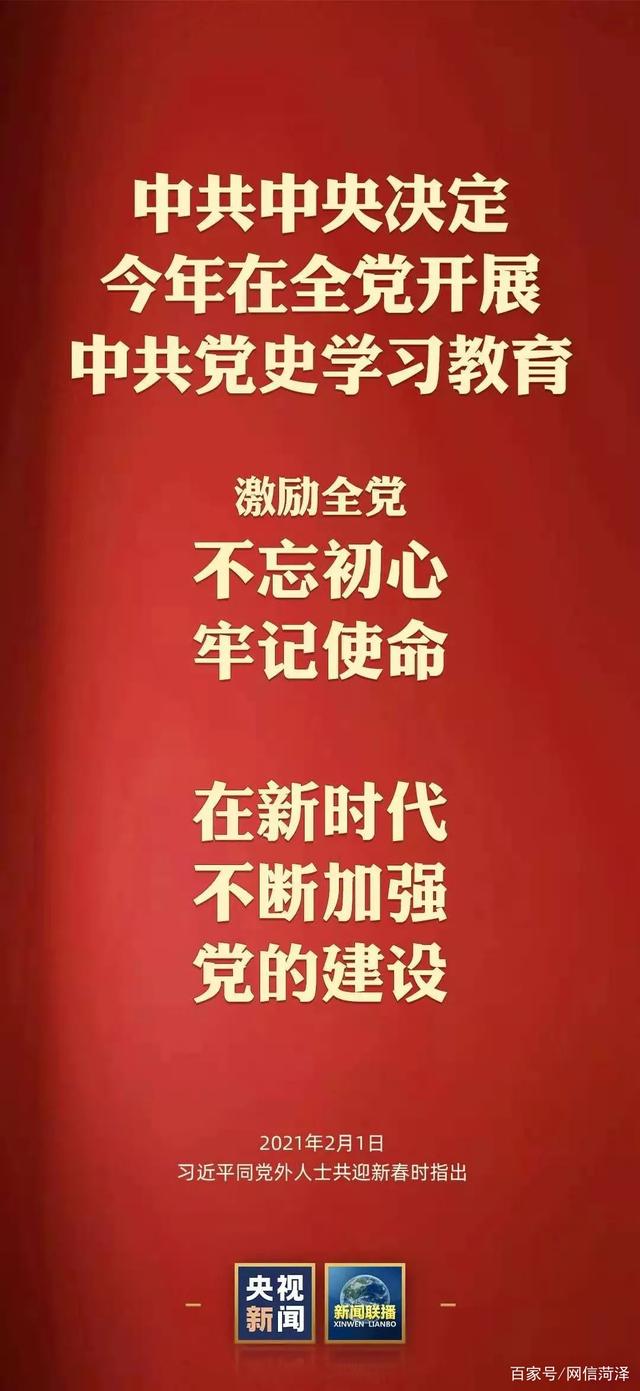 党史学习教育动员大会2021年2月20日上午在北京召开。中共中央总书记、国家主席、中央军委主席习近平出席会议并发表重要讲话。他强调,在全党开展党史学习教育,是党中央立足党的百年历史新起点、统筹中华民族伟大复兴战略全局和世界百年未有之大变局、为动员全党全国满怀信心投身全面建设社会主义现代化国家而作出的重大决策。全党同志要做到学史明理、学史增信、学史崇德、学史力行,学党史、悟思想、办实事、开新局,以昂扬姿态奋力开启全面建设社会主义现代化国家新征程,以优异成绩迎接建党一百周年。