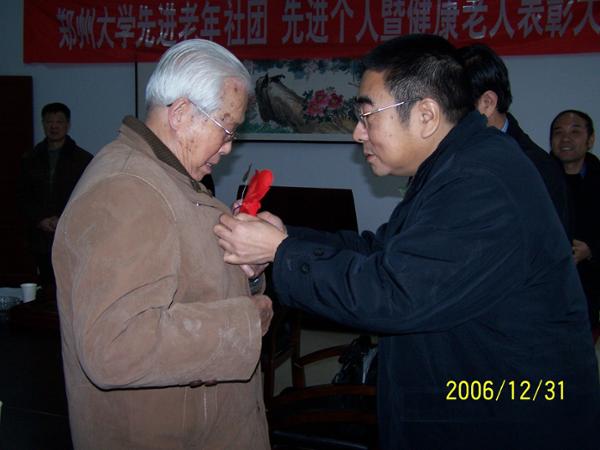 上午郑州大学先进老年社团、社团活动先进个人暨健康老人表彰大会在郑州大学南校区离退休职工活动中心隆重举行。校党委副书记陈一峰、副校长徐振鲁出席大会并为获得健康老人称号的老同志戴上大红花,为获奖先进老年社团、社团活动先进个人颁奖。校党委副书记陈一峰同志代表校党委、校行政在大会上做了重要讲话。离退休职工工作处处长颜振全同志宣读了表彰决定,离退休职工工作处党委书记冯鲁英同志对本次活动进行了总结。郑州大学党委宣传部、郑州大学离退休职工工作处的负责同志和工作人员参加了大会。