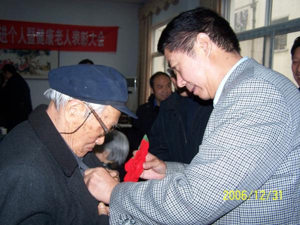 陈一峰副书记为健康老人戴上大红花 徐振鲁副校长为健康老人戴上大红花