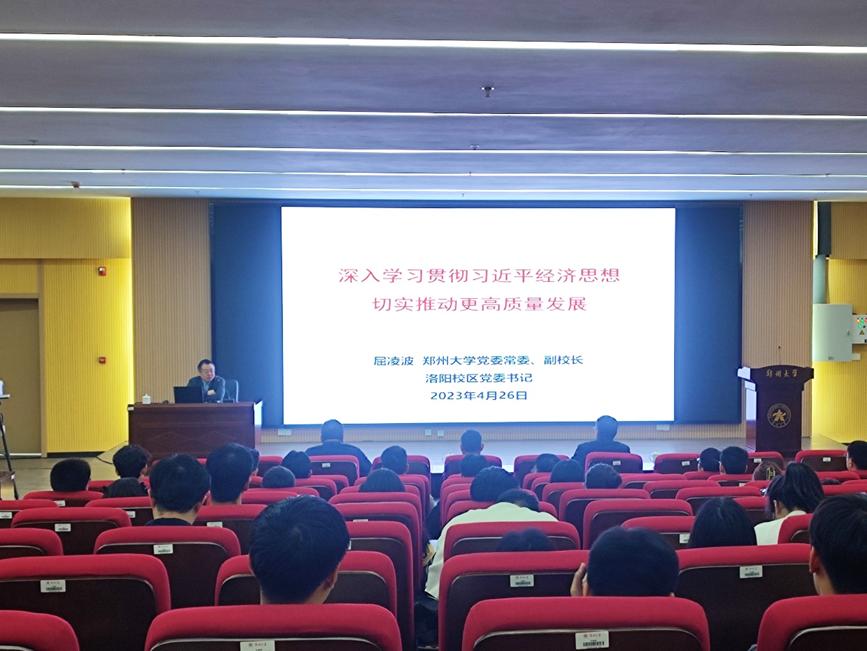 为深入推进学习贯彻习近平新时代中国特色社会主义思想主题教育,加深校区党员干部对习近平经济思想丰富内涵的理解和把握。4月26日,郑州大学党委常委、副校长、洛阳校区党委书记屈凌波以《深入学习贯彻习近平经济思想,切实推动更高质量发展》为题,为校区师生讲授学习贯彻习近平新时代中国特色社会主义思想主题教育专题党课。本次专题党课采用线上线下相结合的方式,校区全体师生党员、入党积极分子聆听了讲座。