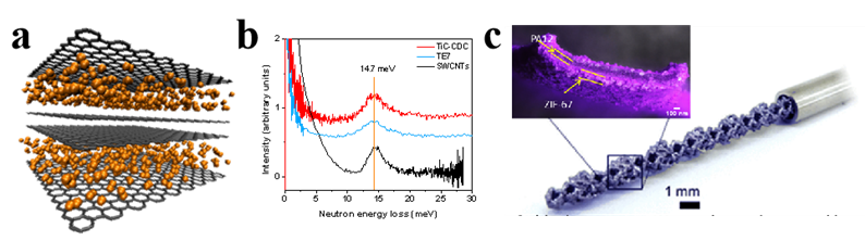 (a) Molecular simulation of hydrogen confined in slit-shaped pores, (b) the Inelastic neutron scattering pattern of solid-like hydrogen at supercritical condition, (c) Hydrogen sponge colum inserted in a tank and the cross-section microscope image