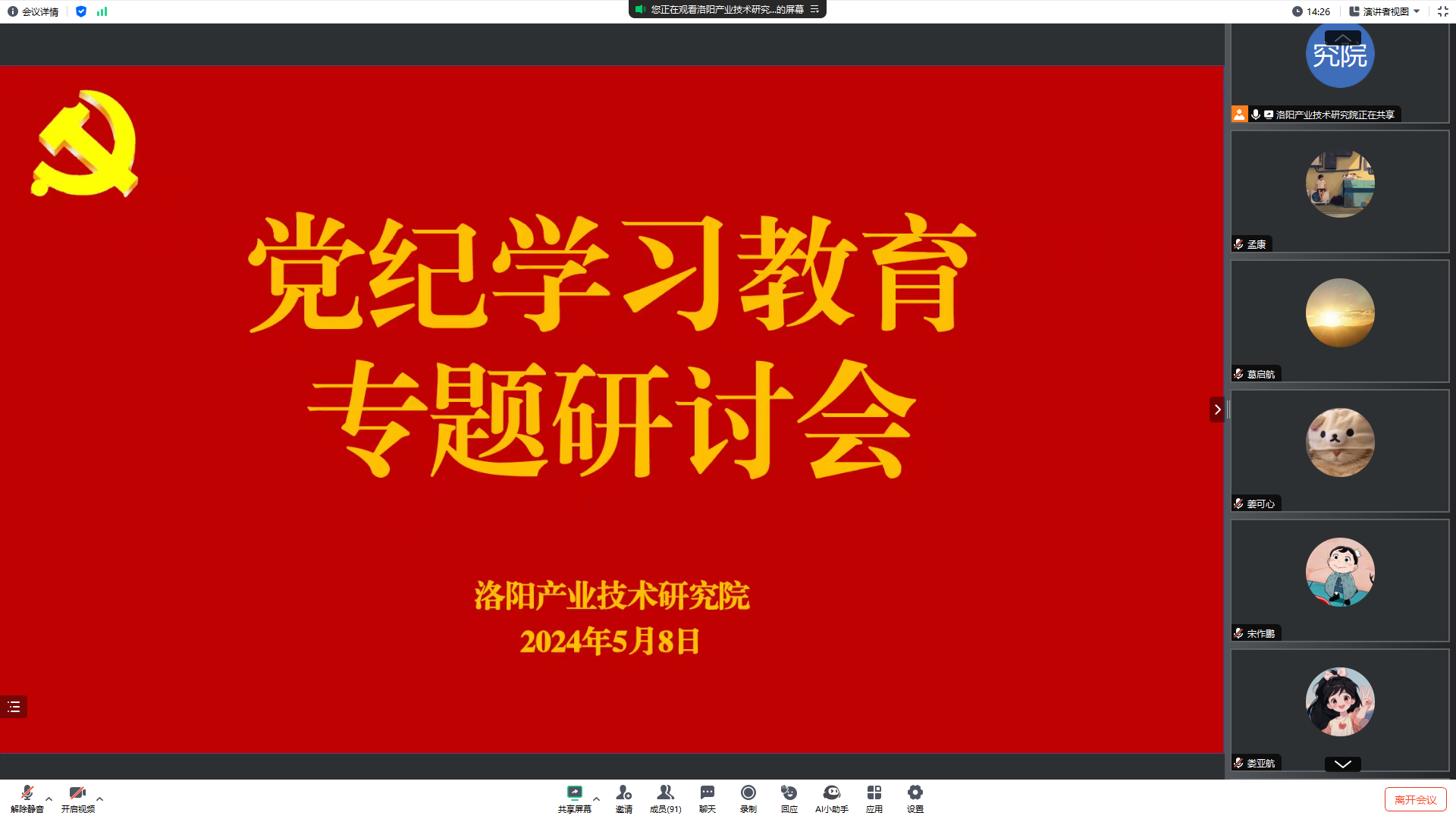 5月8日,洛阳产业技术研究院各支部召开党纪学习教育专题研讨会,会议围绕学习领会习近平总书记关于党纪学习教育的重要讲话和重要指示精神,学习《中国共产党纪律处分条例》(以下简称《条例》)进行深入交流研讨。研究院全体党员、入党积极分子参加会议。