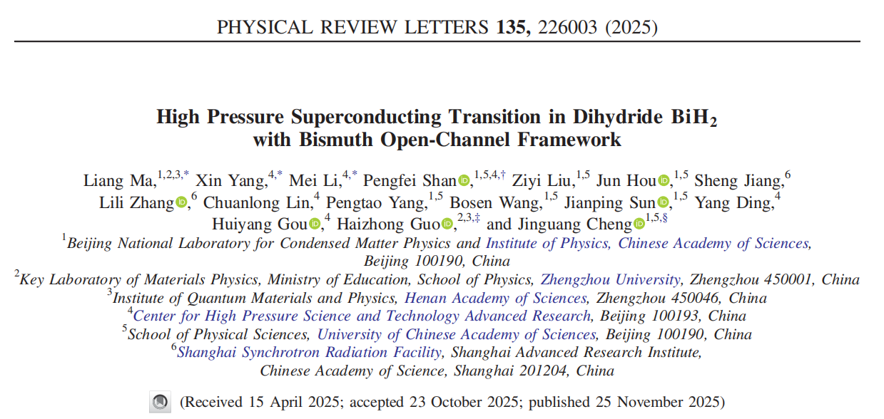 近日,课题组与中国科学院物理研究所程金光研究员团队合作,在探索分子型氢化物超导体方面取得重要进展。相关研究成果以“High Pressure Superconducting Transition in Dihydride BiH2with Bismuth Open-Channel Framework”为题发表在Phys. Rev. Lett.上。郑州大学马良副研究员、北京高压科学研究中心博士后杨欣和李梅为论文共同一作,北京高压科学中心博士后单鹏飞、郑州大学郭海中教授、物理所程金光研究员为论文共同通讯作者。