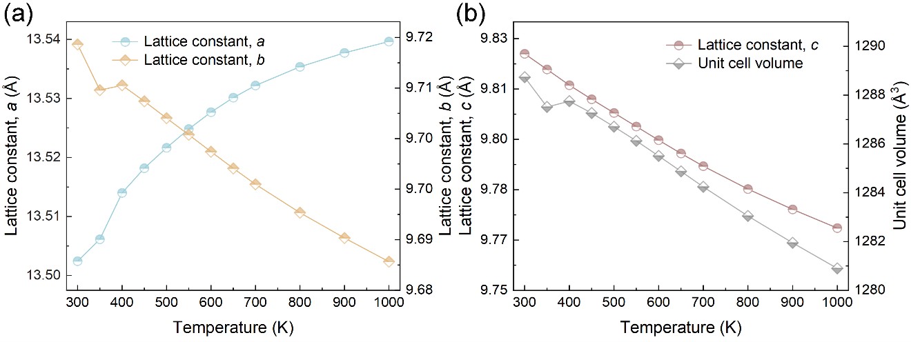 图1. (a) 晶格常数a和b;(b)晶格常数c以及晶胞体积V在300-1000K温度范围内的温度依赖性。