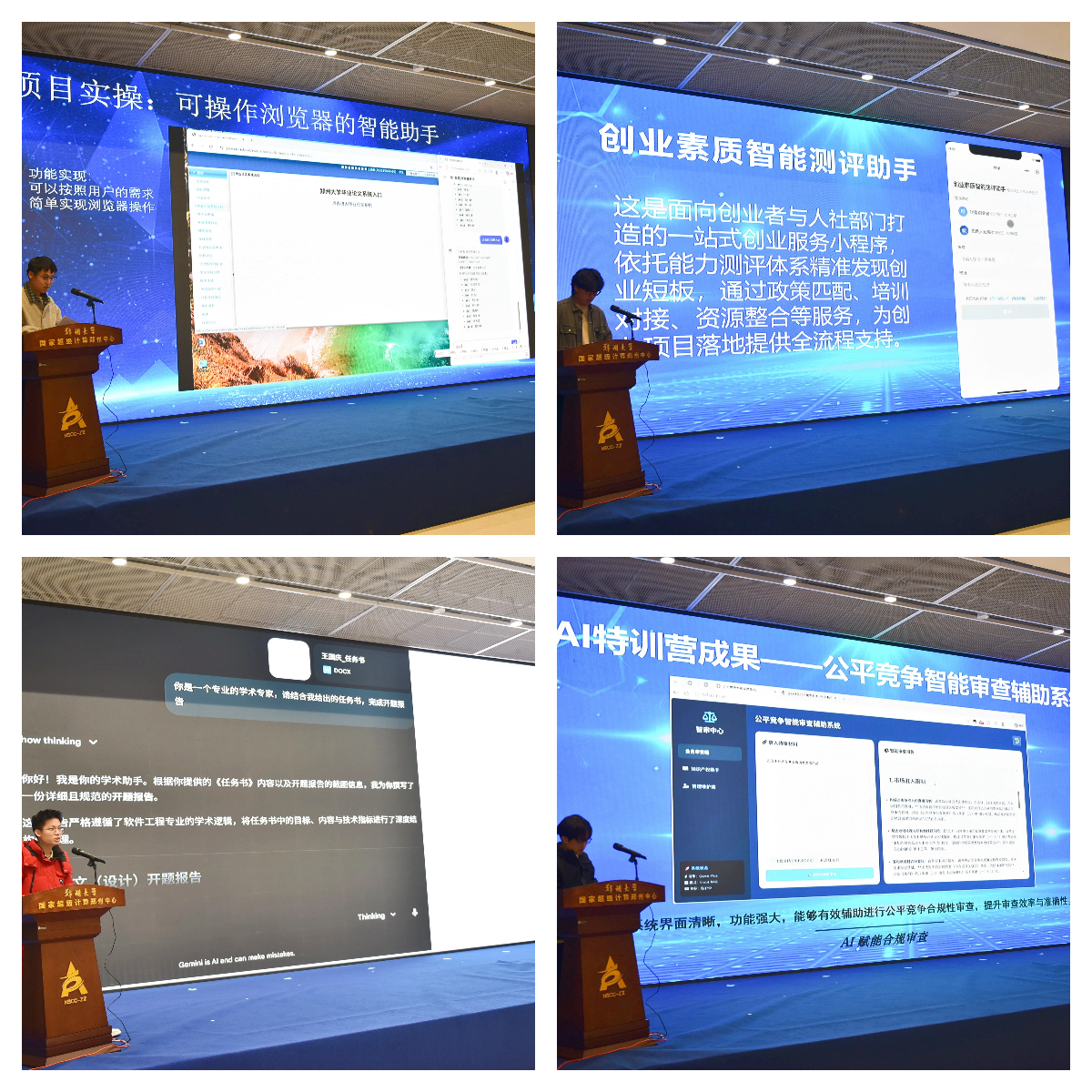 随后,来自郑州大学计算机与人工智能学院的四位首期优秀学员代表分享了他们的项目成果与深刻感悟。软件工程2022级1班王国玺同学展示了“可操作浏览器的智能助手”项目,实现了对网页信息的智能抓取与自动化操作;2025级4班韩智企同学分享了“创业素质智能测评助手”项目,利用AI模型对创业者的核心能力进行量化评估;2022级2班王国庆同学完成了“个人学术助手”的创作,旨在高效辅助文献管理与知识梳理;2022级1班王延同学则聚焦“公平竞争智能审查辅助系统”项目,探索AI在商业合规领域的应用。这些源于真实需求、在两周内快速实现的原型项目,生动诠释了“产业出题、科技解题、市场检验”的创新逻辑,展现了AI时代青年学子发现问题、理解场景、组织资源并推动落地的核心能力。