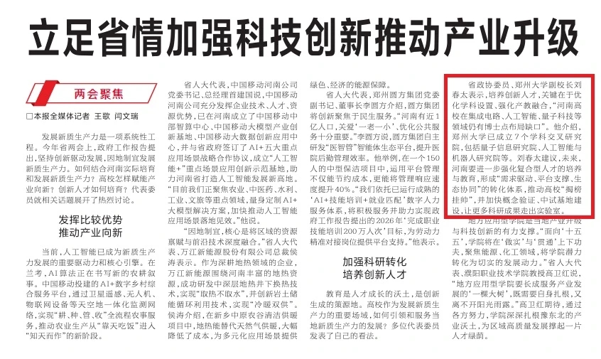 “培育新质生产力,核心在人才,关键看高校能否培养出‘懂技术、懂产业、能攻坚’的复合型人才。”刘春太以人才培养作为切入点,直指高校人才培养体系与产业需求的适配性问题。他认为,高校需围绕河南“7+28+N”重点产业布局,在学科设置上实现“两个聚焦”:一方面聚焦生物医学、人工智能、量子信息、新能源、新材料等战略性新兴产业,布局前沿学科;另一方面依托河南农业与制造业基础,打造智慧农业、高端装备制造等特色学科。