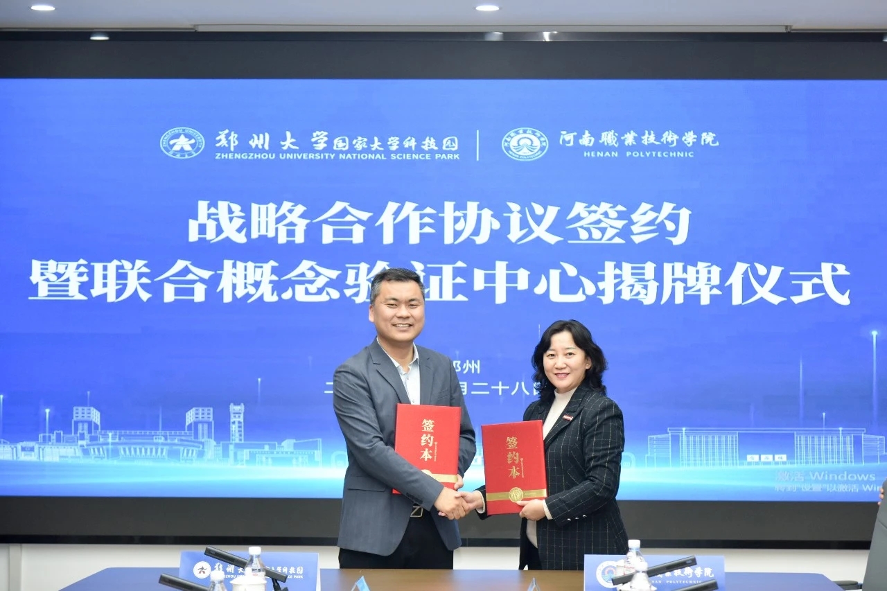 1月28日上午,郑州大学国家大学科技园与河南职业技术学院合作协议签约暨联合概念验证中心揭牌仪式在河职创新港举行。河南职业技术学院党委书记厉励,党委副书记、校长夏新颜,郑州大学党委常委、副校长胡少伟,大学科技园建设管理中心副主任(主持工作)、科学技术研究院副院长、科技园公司总经理张文良出席会议。科技园中心副主任裴东杰、许觅婷,科技园公司副总经理庆捷陪同参会。双方相关部门和科研团队成员参加会议。