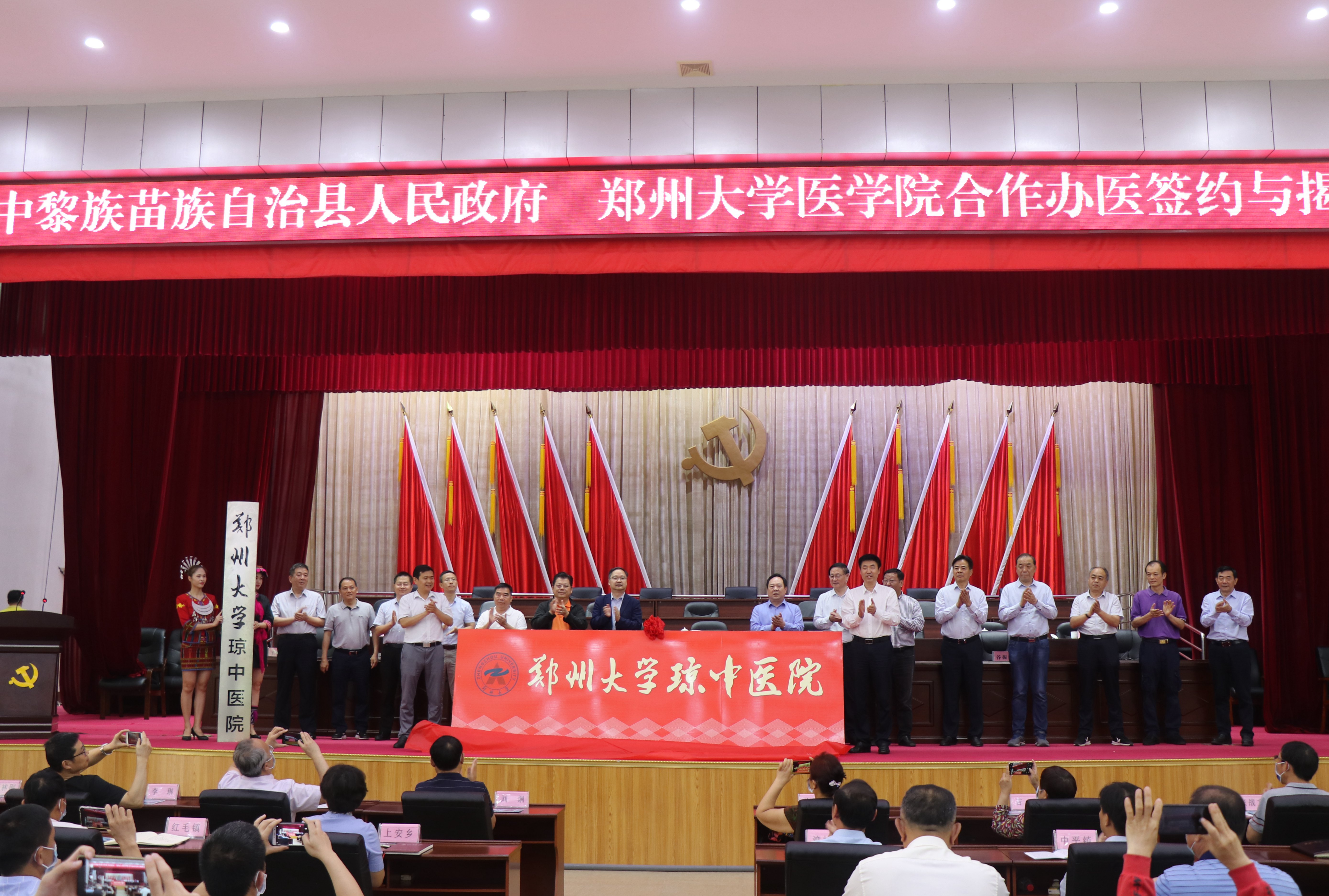 刘章锁和琼中县副县长陈海滨代表双方签署《海南省琼中黎族苗族自治县人民政府郑州大学医学院托管协议》。宋争辉、徐斌共同为郑州大学琼中医院揭牌。