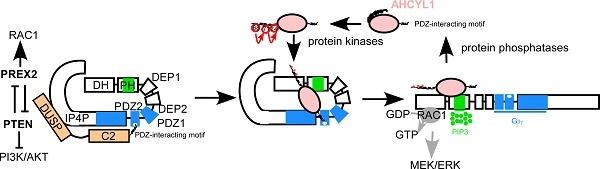 肺癌是目前人类最常见的恶性肿瘤之一,在全球范围内其发病率和死亡率均居于高位。近年来肺癌的诊断手段、手术技术、放化疗和靶向治疗等方面得到了不断更新和发展,但是占肺癌总数80%-85%比例的非小细胞肺癌(Non-small Cell Lung Cancer,NSCLC)仍待发现新的治疗靶标。磷脂酰肌醇-3,4,5-三磷酸依赖的Rac交换因子2 (phosphatidylinositol -3,4,5- trisphosphate dependent Rac exchange factor 2, PREX2)在多种肿瘤组织中出现出现异常扩增和高表达现象,但是PREX2在非小细胞肺癌发生发展过程中的功能和分子机制还尚未有详细研究。研究团队发现类腺苷半胱氨酸酶1(Adenosylhomocysteinase Like 1,AHCYL1)与PREX2存在相互作用,AHCYL1的磷酸化状态对于二者的相互作用至关重要。深入研究发现AHCYL1结合PREX2的DH、PH区段增强PREX2 DH-PH的GEF活性;并且能够通过其C端PDZ-binding motif与PTEN竞争性结合PREX2的PDZ2区段,解除PTEN对PREX2 全长GEF活性的抑制,从而调控PREX2在非小细胞肺癌中的促癌作用。