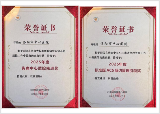 近日,在河南省冠心病介入质控中心暨胸痛中心建设总结工作会议上,郑州大学附属洛阳市中心医院凭借在急性胸痛救治体系建设与急性冠脉综合征(ACS)患者全流程管理中的卓越表现,一举斩获“河南省标准版胸痛中心先进质控单位”“ACS管理随访优秀单位”两项省级荣誉,标志着该院在相关领域的规范化、精细化管理水平位居全省前列,为豫西地区心血管疾病防治事业树立了新标杆。