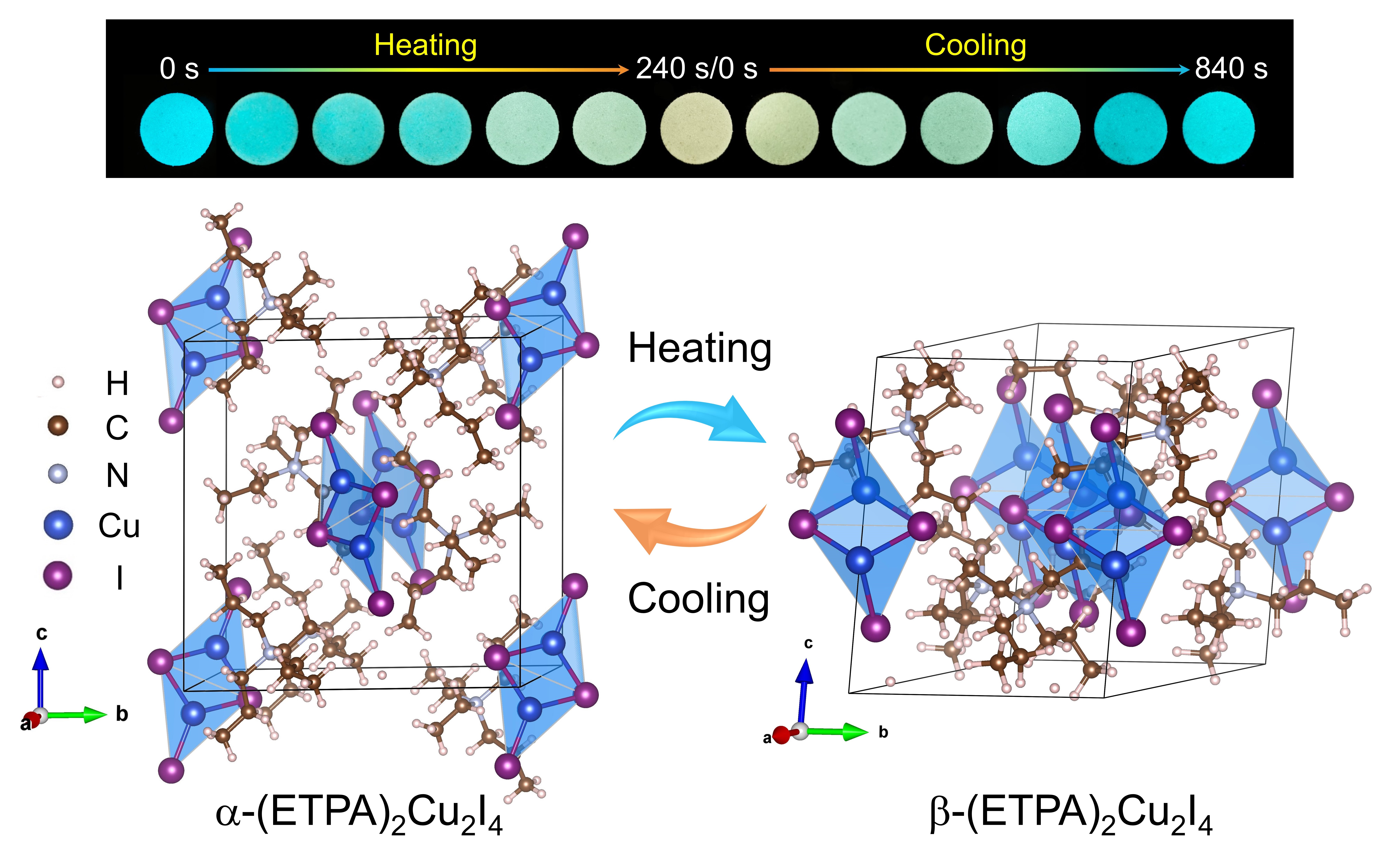 热致变色发光材料能够响应温度变化而改变发光颜色,在传感、防伪和信息加密等领域具有广阔的应用前景。然而,传统的热致变色发光材料往往面临发光效率低、发光切换可逆性差以及高温下发光强度骤降等瓶颈问题。零维杂化金属卤化物因其发光效率高、结构灵活多样和丰富的激发态特性,成为解决这些问题的理想候选材料之一。其中,铜基卤化物因其多样的配位构型和独特的自陷态激子发光机制,尤其受到研究者关注,但对其可逆相变与发光切换之间的内在机理仍需深入探索,以实现“小输入大输出”的智能响应光学信号。