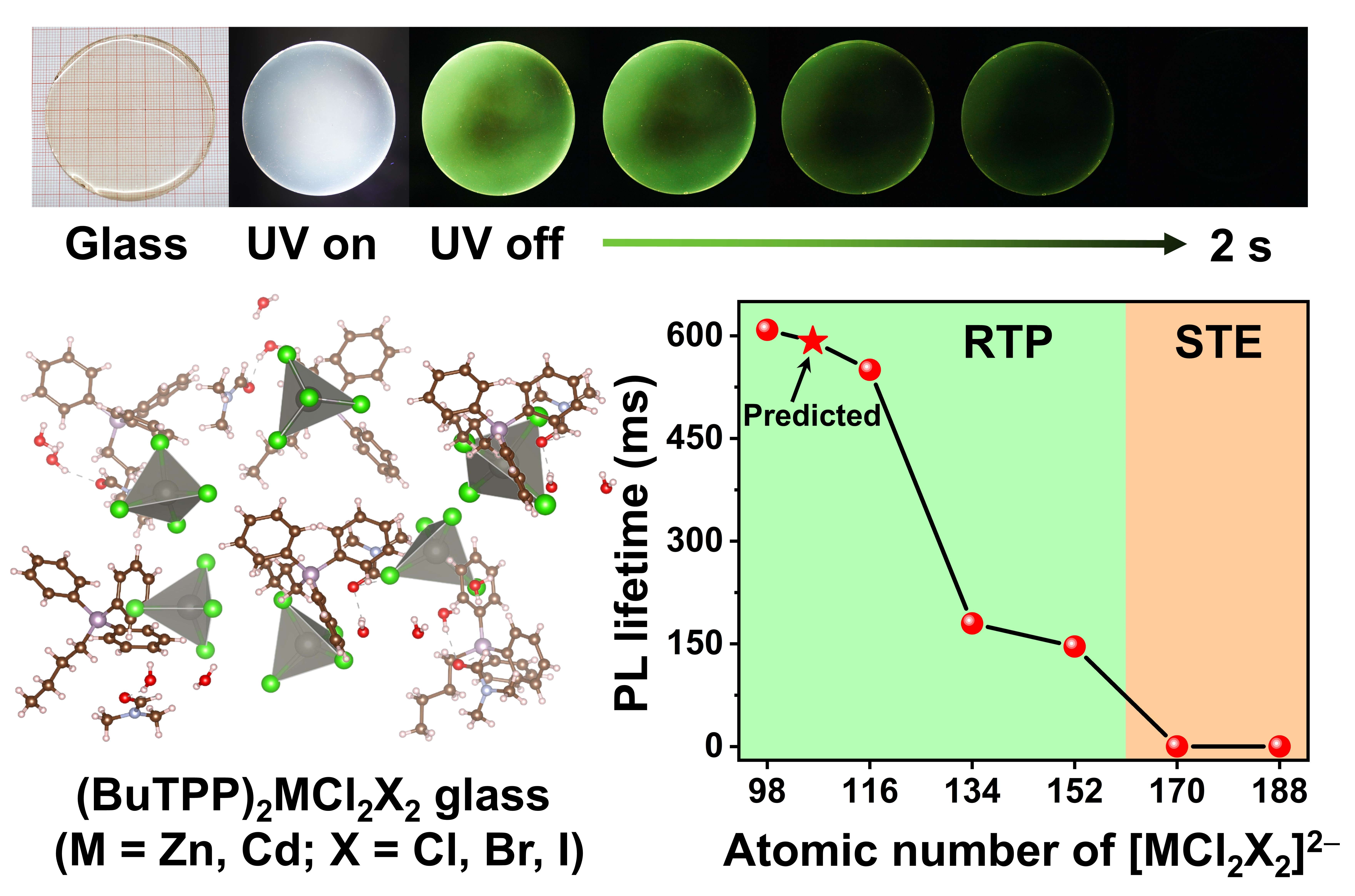 室温磷光因其长寿命发光特性和大斯托克斯位移,在防伪识别、生物成像及光电器件等领域具有广泛的应用前景。然而,如何实现磷光性能的精确调控一直是该领域的研究难点。史志峰教授团队创新性地提出了一种溶剂辅助快速蒸发法,在不经熔融过程的条件下,成功制备出一系列杂化金属卤化物玻璃,(BuTPP)2MCl2X2 (M = Zn, Cd; X = Cl, Br, I)。
