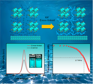 鉴于此,史志锋教授团队通过引入多功能配体乙二醇二甲基丙烯酸酯(ethylene glycol dimethacrylate,EGDMA)取代钙钛矿纳米晶表面的原始配体,成功制备了一种具有优异稳定性的青色CsPb(Br/Cl)₃钙钛矿纳米晶。研究表明,EGDMA分子中的羰基能够通过孤对电子与表面未完全配位的Pb²⁺离子发生配位作用,从而有效钝化表面缺陷,显著提升纳米晶的光致发光量子效率。同时,EGDMA中的C=C双键在 365 nm紫外光照射下可发生光交联反应,在纳米晶表面形成致密的聚合物网络结构,进一步显著增强了材料的整体稳定性。最后,将该光交联处理后的钙钛矿纳米晶应用于水下无线光通信系统中,实验结果表明,该体系在水下条件下实现了高达2.7 MHz的-3 dB带宽,并成功实现了实时数据传输,验证了其在UWOC领域的应用可行性。