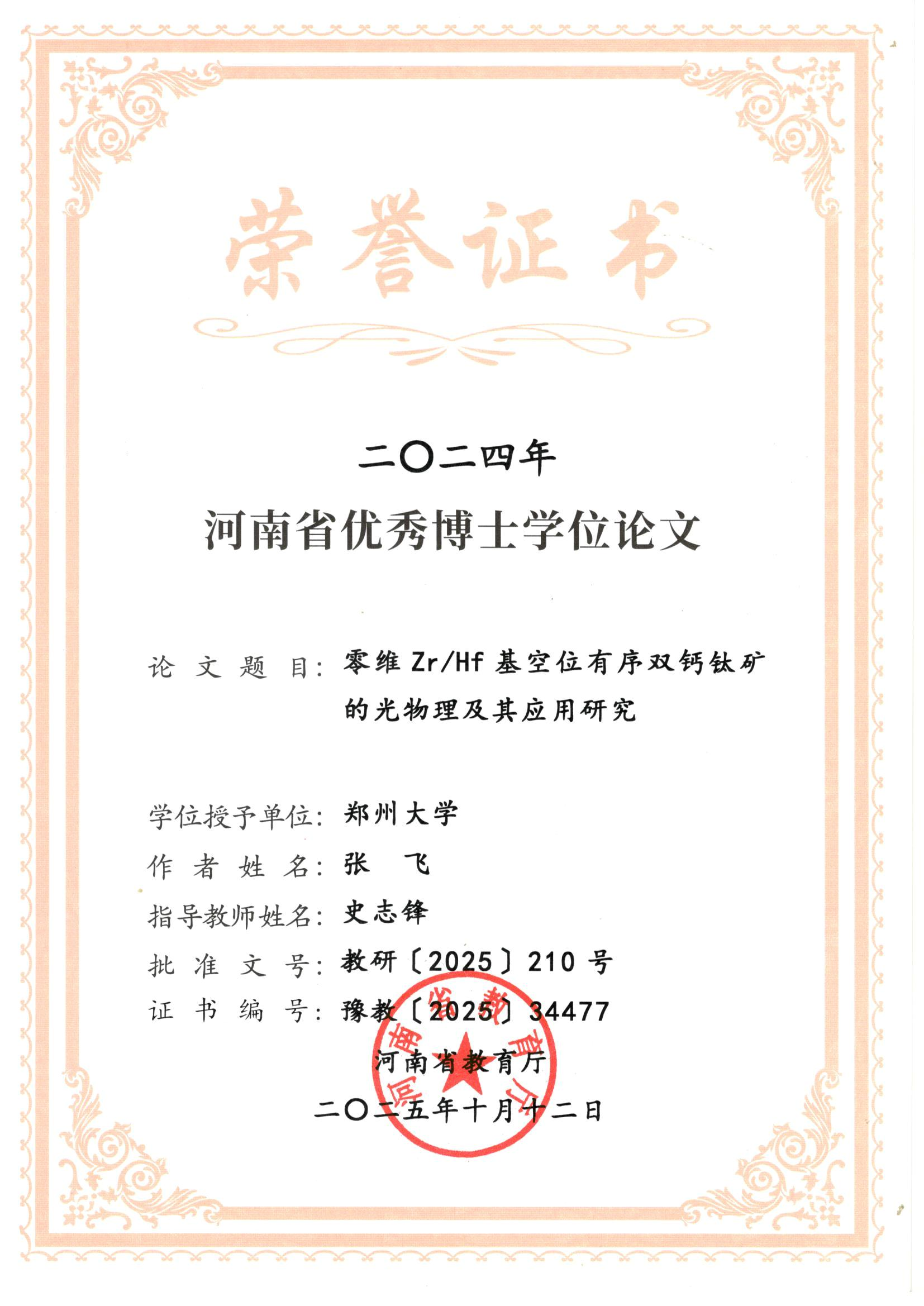 近日,河南省教育厅、河南省学位委员会公布了2024年省级优秀博士、硕士学位论文获奖名单,由课题组史志锋教授指导的2024届凝聚态物理专业博士生张飞、硕士生林帅领完成的学位论文荣评2024年河南省优秀学位论文。